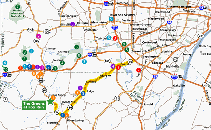 From 1-270, take exit #5 at Gravois Rd./Hwy. 30 and go 13.5 miles west on State Hwy. 30. Turn right at Hwy. W and go 2.7 miles to The Greens at Fox Run on your right. |